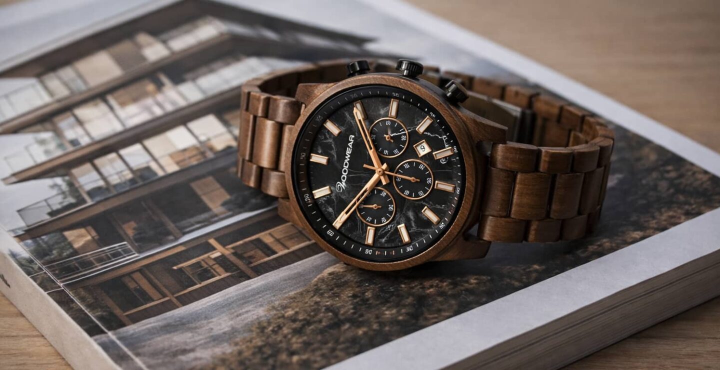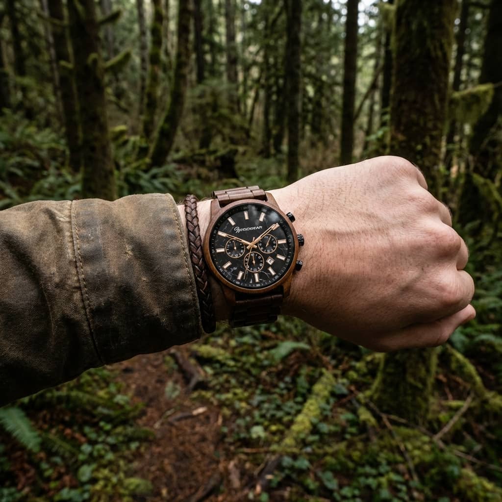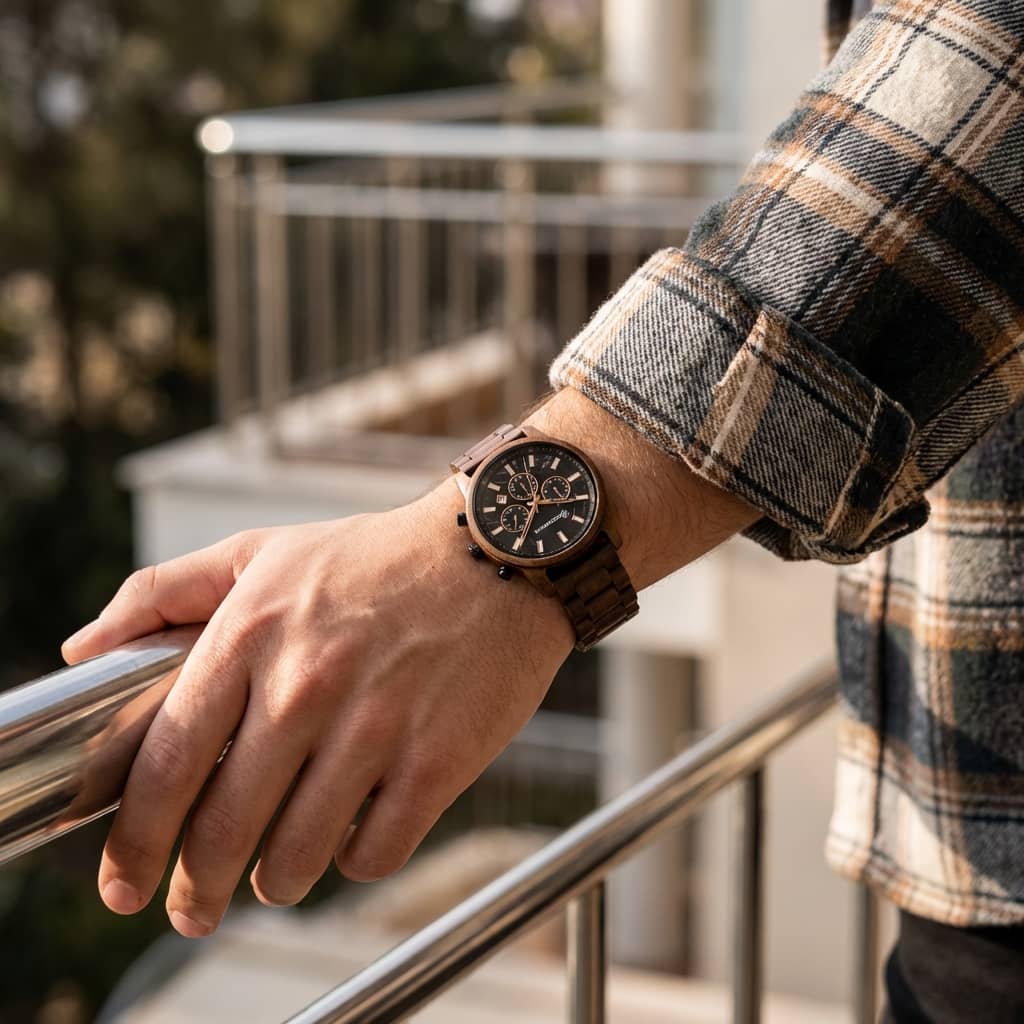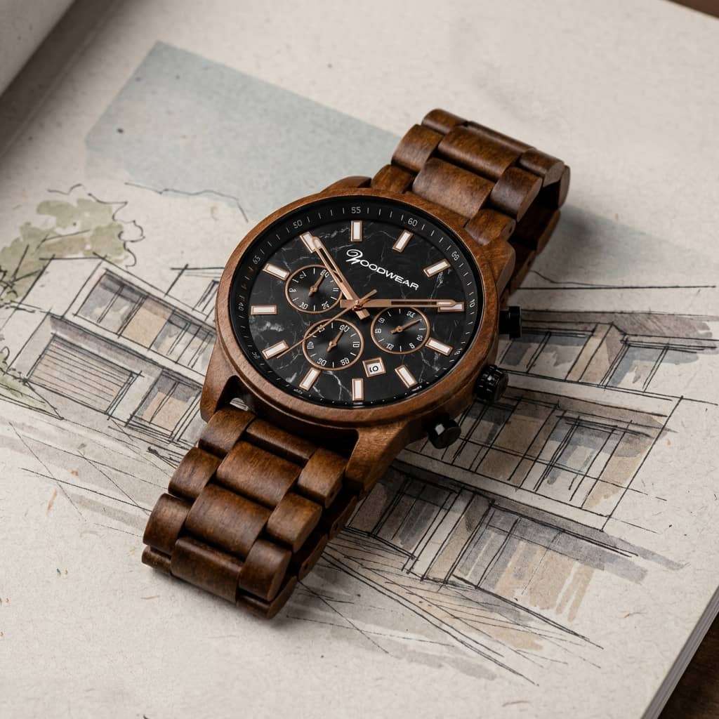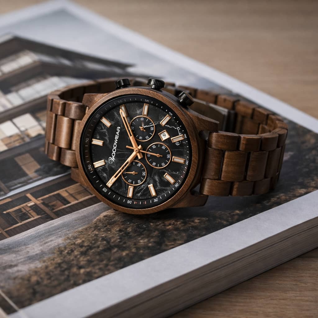 Zegarek wykonany jest z naturalnego drewna orzechowego, a jego bransoleta została zaprojektowana z myślą o komforcie codziennego noszenia.