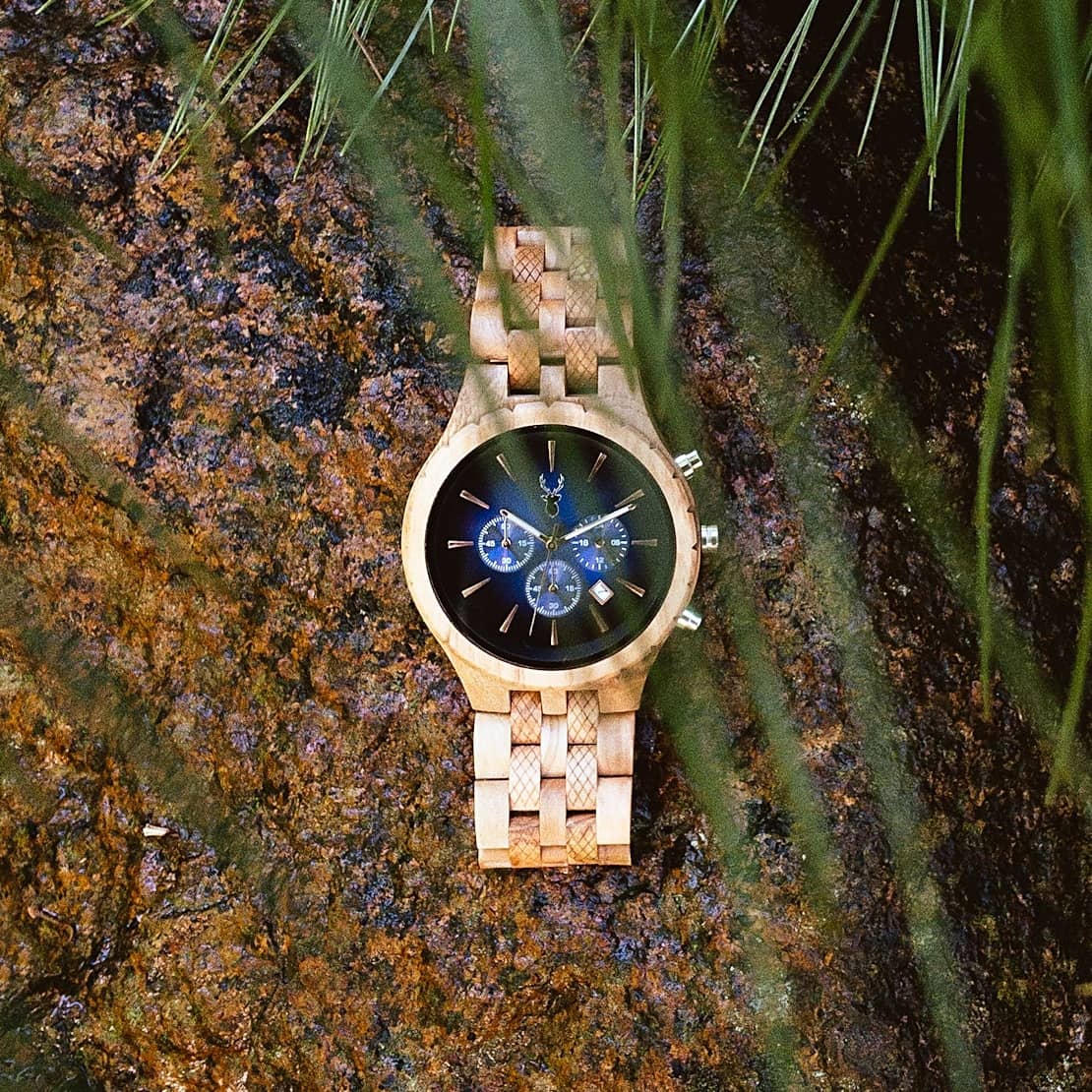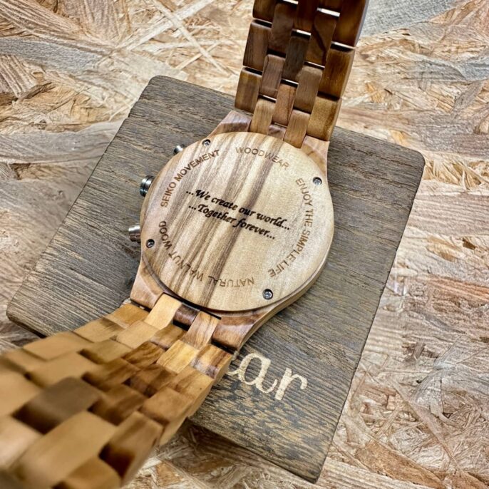 Zegarek wykonany jest z naturalnego drewna oliwnego, a jego bransoleta została zaprojektowana z myślą o komforcie codziennego noszenia.
