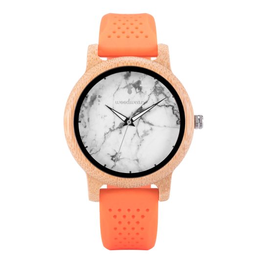 Emerson to zegarek, który harmonijnie łączy bambusową kopertę z odważnym paskiem w kolorze pomarańczowym, tworząc wyróżniający się styl.