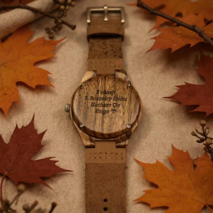 Na drewnianym dekielku możemy umieścić imię, datę lub krótką sentencję, tworząc prezent z prawdziwym znaczeniem. To detal, który sprawia, że zegarek nie tylko mierzy czas, ale zatrzymuje wspomnienia.