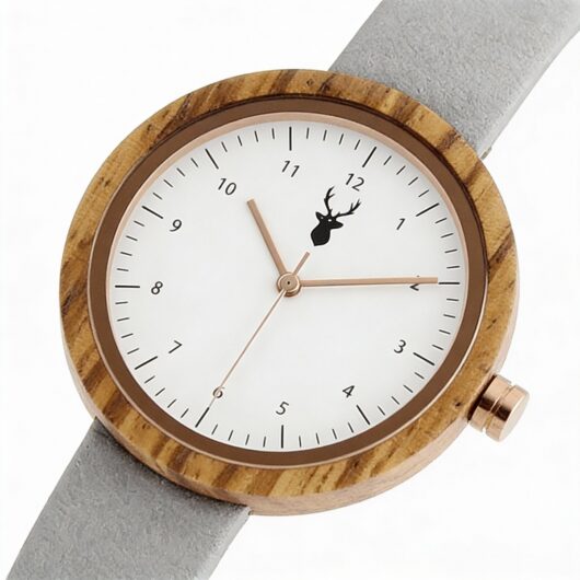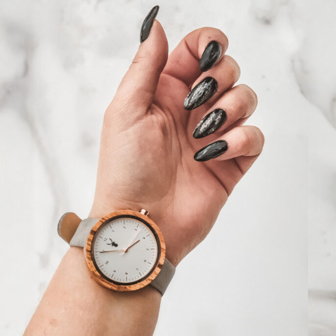 Mirella Grey to zegarek damski, który łączy ponadczasowy minimalizm z naturalną elegancją. Jasna, minimalistyczna tarcza zestawiona z szarym paskiem z wegańskiej skóry oraz kopertą wykonaną z drewna zebra wood tworzy harmonijną i lekką formę, idealną na każdy dzień.