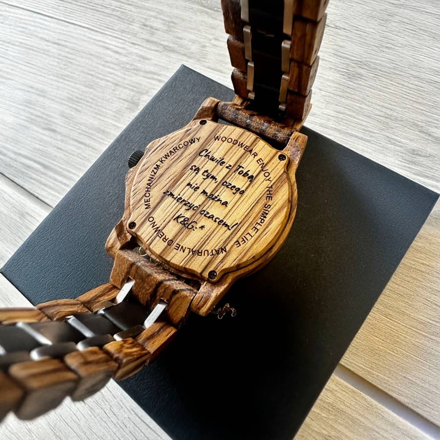Możliwość wykonania graweru na drewnianym dekielku sprawia, że zegarek staje się osobistą pamiątką – symbolem ważnych chwil i relacji.